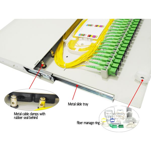 The box with 4pieces cable entry clamps and rubber seals to prevent dust or rat, which make fiber management easy and nice. The metal slide tray is better than plastic tray, it is long time use no break, it is very smooth and convenient to take out of the internal tray.